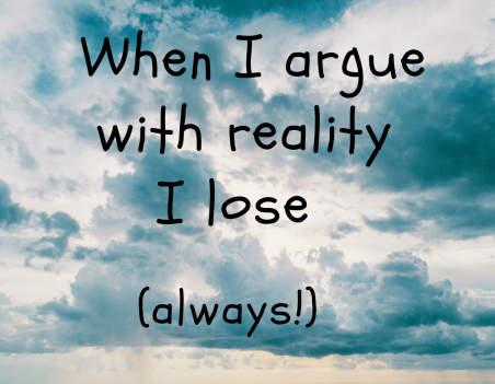 How do I know I'm arguing with reality? First I notice the feeling; if it's negative, like fear, anger, sorrow, etc. then I ask myself what am I thinking? Actually thoughts create the emotion, but the feeling is like an alarm clock that yells, “Wake up!” The thoughts that argue with reality are the “shoulds and shouldn'ts” like “He should___. She shouldn't___. They should___. I shouldn't__.” See statement 3 on the worksheet. When I believe these thoughts, I cause my own unhappiness, and I may need to do a worksheet to get free from that.